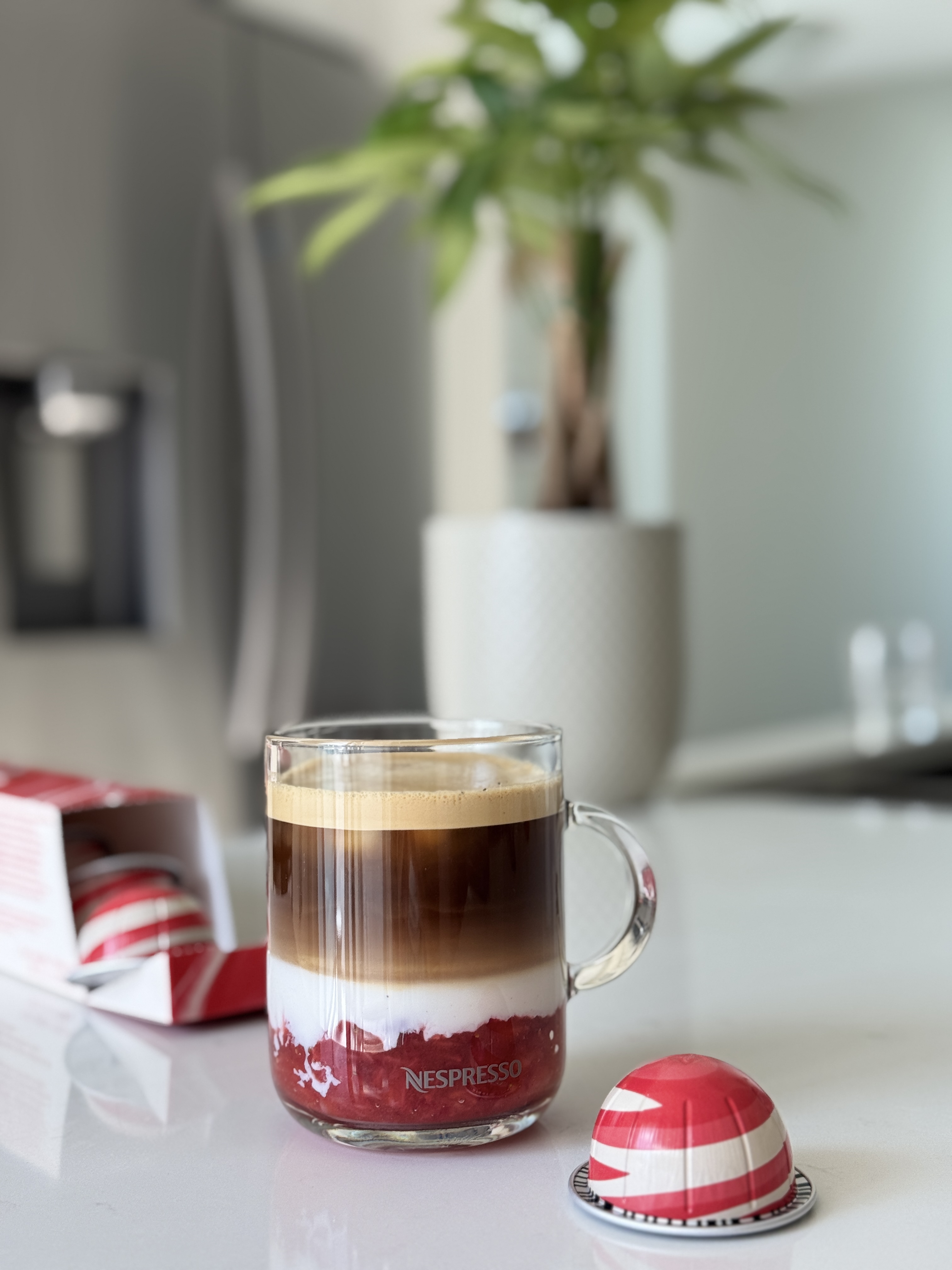 - 4.Pour espresso base into mug, top with frothed milk.